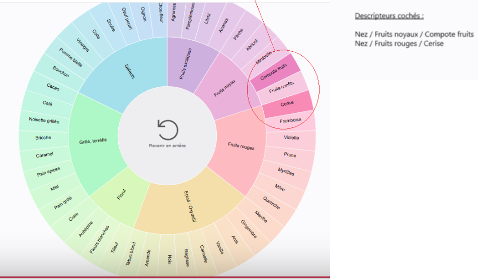 - Aroma wheel : a chart near the color wheel with the selected descriptors allows you to to facilitate review of what has or has not been checked, particularly in the case of large zooms and a very large number of descriptors.